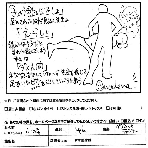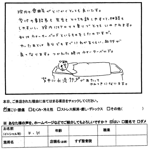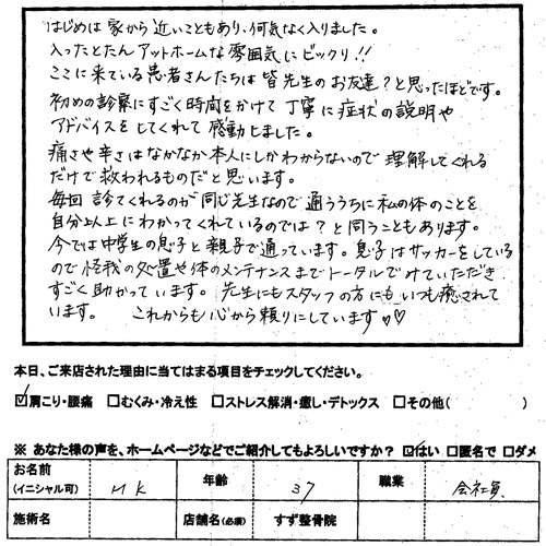 怪我の処置や体のメンテナンスのトータルケア 中学生の息子と親子で通っております はじめは家から近いこともあり、何気なく入りました。 入ったとたんアットホームな雰囲気にビックリ ![]() ![]() ここに来ている患者さんたちは皆先生のお友達 と思ったほどです。初めの診察にすごく時間をかけて丁寧に症状の説明や アドバイスをしてくれて感動しました。 痛さや辛さはなかなか本人しかわからないので理解してくれる だけで救われるものだと思います。 毎回診てくれるのが同じ先生なので通ううちに私の体のことを 自分以上にわかってくれているのでは と伺うこともあります。今では中学生の息子と親子で通っております。息子はサッカーを しているので怪我の処置や体のメンテナンスまでトータルでみて いただきすごく助かっています。先生にもスタッフの方にもいつも 癒されています。 これからも心から頼りにしています ![]() ![]() 怪我の処置や体のメンテナンスのトータルケアは 東大和市すず整骨院へおまかせください 東大和市すず整骨院ブログ 東大和市すず整骨院 膝痛 背中に水流があたってやみつきになります。 東大和市すず整骨院
