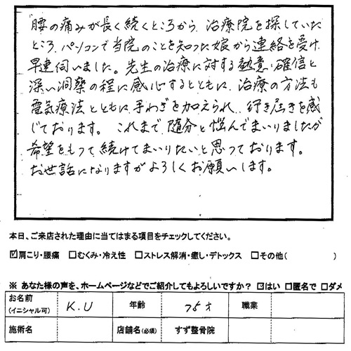 腰の痛み これまで随分悩んでまいりましたが 希望をもつて続けてまいりたい 腰の痛み が長く続くところから、 治療院 を探していたところ パソコンで当院のことを知った娘から連絡を受け 早速伺いました。先生の治療に対する熱意、確信と 深い洞察の程に感心するとともに、治療の方法も 電気療法とともに 手わざ を加えられ 行き届きを感じております。 これまで随分悩んでまいりましたが 希望をもつて続けてまいりたいと思つております。 お世話になりますがよろしくお願いします。 75歳 女性 腰の痛みで年齢だからと言われ諦めていた患者さまですが 当院の治療で痛みが相当軽減し前向きに考え 今では押し車も忘れて帰るほど回復しております。 腰の治療で諦めている患者さまはすず整骨院へご相談ください!