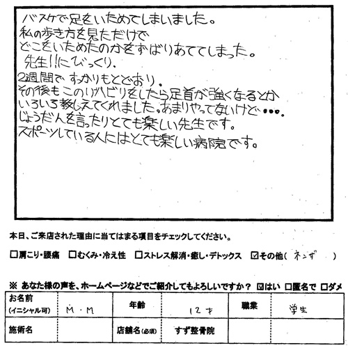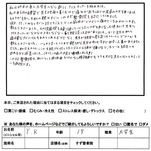 アイスホッケーで足首をけが(スポーツ外傷) 私は、昨年の春に大学生になり新しくアイスホッケーを始めました。 私はある日の練習で足を地面に着くだけで痛みが出るほどの足首のケガを負いました そのケガを知った私の親はすぐにこのすず整骨院を紹介してくれました 後日、行ってみるとすぐに診てもらえてどこの筋肉がどのように痛めているのかわかり やすく教えて下さいました。その後通院を繰り返していくうちにケガも良くなった頃 先生は私にアイスホッケーがなかなか上手くならない事を相談した日がありました。 そこで先生は私に適切なアドバイスを与えてくれただけでなく、先生が独自に考え 出したトレーニングメニューを教えて下さいました。ハッキリ言ってここまで親切な 先生は私は今まで出会った事がありませんでした。私はそのトレーニングを続けて 行くうちにどんどん体が強くなり、今では試合にも出れるまで成長しました。 (そしてこの前の大会で優勝しました!) このすず整骨院は、私にとって肉体面だけでなく精神面でもとても大きな支えに なってもらっている病院です。 東大和市 大学生 東大和市すず整骨院 スポーツ外傷 足首のけが |