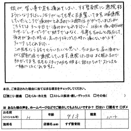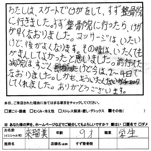 フィギュアスケートで足をけが(スポーツ外傷) わたしは、スケートでけがをして、すず整骨院に に行きました。すず整骨院に行ったら、けが が早くなおりました。マッサージは、いたい けど、後がよくなります。その時は、いたくても がまんしてよかったと思いました。前行ってた 病院は、すごく長かったけど今は、2~4日で 治りました。しかも、もういたくないがチェック してくれました。ありがとうございます。 小平市 9歳 東大和市すず整骨院 スポーツ外傷 足のけが 東大和市すず整骨院ブログ 肩の痛み・顎関節症・マッサージ・テーピング 娘が、習い事で足を痛めてしまい、すず整骨院に通院する ようになりました。治りがとても早く正直驚いてます。以前通院 していたところで痛みがとれるのに2週間位かかっていましたが こちらでは3~4日で痛みがとれました。以前の痛い部分のみ マッサージし、テーピングで終了ではなく、全身をちゃんと指圧して、 痛みがあった時は、走ったりジャンプした時に痛くないか必ず チェックしてくれました。 この先生なら診てもらいたいと思い、今は私も、肩の痛みと がく関節症で通院しています。通院した日はよく眠れるので 助かっています。先生もスタッフの方も明るく親切なのでストレスも 一緒にほぐれますよ。 小平市 主婦 東大和市すず整骨院 肩の痛み・顎関節症