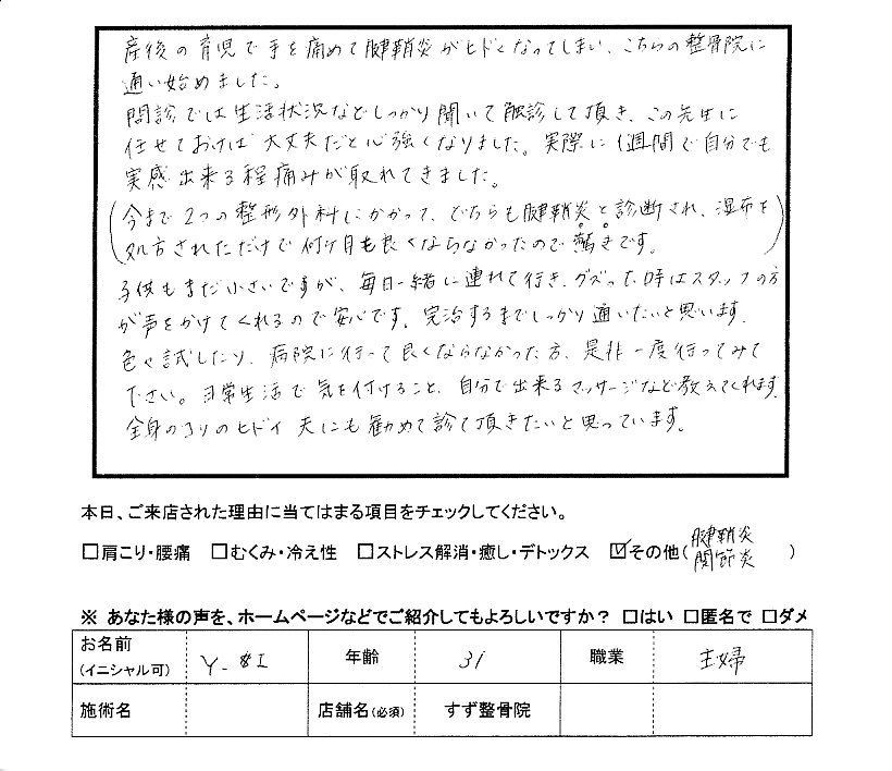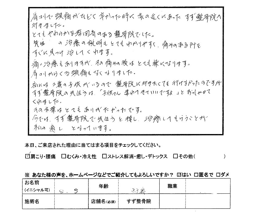 × [PR]上記の広告は3ヶ月以上新規記事投稿のないブログに表示されています。新しい記事を書く事で広告が消えます。 産後の育児で産後で手を痛めて腱鞘炎がひどくなってしまい、こちらの整骨院に 通い始めました。 問診では生活状況などしっかり触診して頂き、この先生に 任せておけば大丈夫だと心強くなりました。実際に1週間で自分でも 実感出来る程痛みが取れてきました。 今まで2つの整形外科にかかって、どちらも腱鞘炎と診断され、湿布を ・・・ 処方されただけで何ヶ月も良くならなかったので驚きです。 子供もまだ小さいですが、毎日一緒に連れて行き、グズった時はスタッフの方 が声をかけてくれるので安心です。完治するまでしっかり通いたいと思います。 色々試したり、病院に行って良くならなかった方は、是非一度行ってみて 下さい。日常生活で気を付けること、自分で出来るマッサージなども教えてくれます。 全身のコリのヒドイ 夫にも勧めて診て頂きたいと思っています。 Y・I 31歳 主婦 腱鞘炎 関節炎 肩こりで頭痛がひどく辛かった時に家の近くにあったすず整骨院へ 行きました。 とてもやわらかな雰囲気のある整骨院でした。 先生の治療の説明もとてもわかりやすく、痛みのある所を すぐに見つけ治してくれます。 痛い治療もありますが、その痛みの後はとても楽になります。 肩コリからくる頭痛もなくなりました。 私には2歳の子供がいるので整骨院に行きたくても行けなかったのですが すず整骨院の先生方は 『 子供さん連れてきていいですよ 』 とおっしゃって くれました。 その言葉はとてもありがたかったです。 今では、すず整骨院で先生方と接し、治療してもらうことが 私の癒し となっています。 肩コリ 頭痛 S・S 33歳 主婦 ![]() ぎっくり腰になってしまい、整形外科に通いました。薬と注射と湿布とコルセットとストレッチのやり方の紙をもらってもなかなかよくならず、ネットですずを見つけました。他は、予約制なのにすず整骨院は、予約がないのでバイトが長引いても行ける所がいいです。スタッフの方は、みんな優しい感じの人ばかりで疑問に思ったことをちゃんと聞けるし丁寧に答えてくれていいです。最初に院長先生が今骨がどうなってて痛くなってるのか説明してくれるので、マッサージしてもらっている時に今なにしているのかがわかります。押されて痛いののはその時だけで終ると、ふつうに歩けたり、チャリに乗れたりできます。痛さを卒業できるまですずに通いつずけます。 ぎっくり腰は東大和 すず整骨院へ
