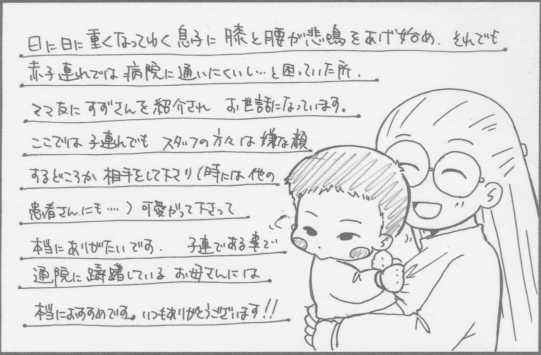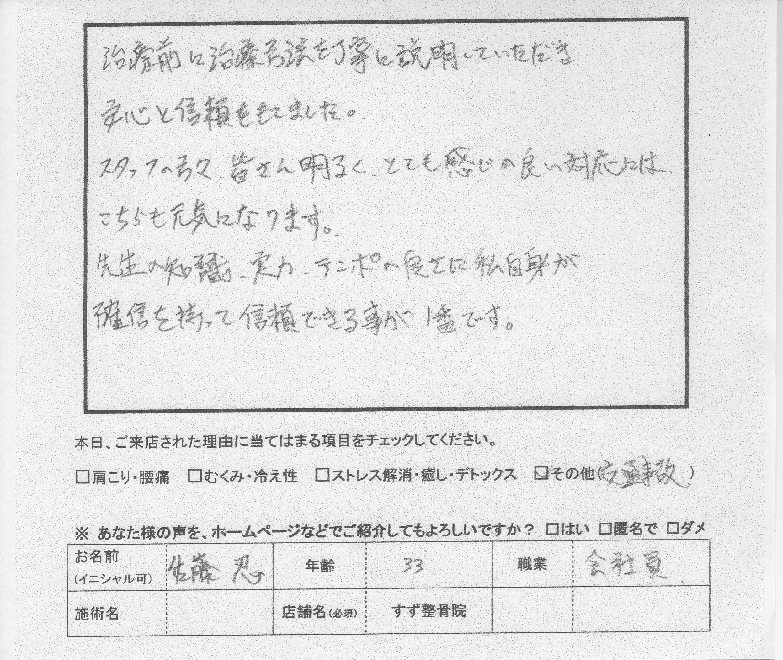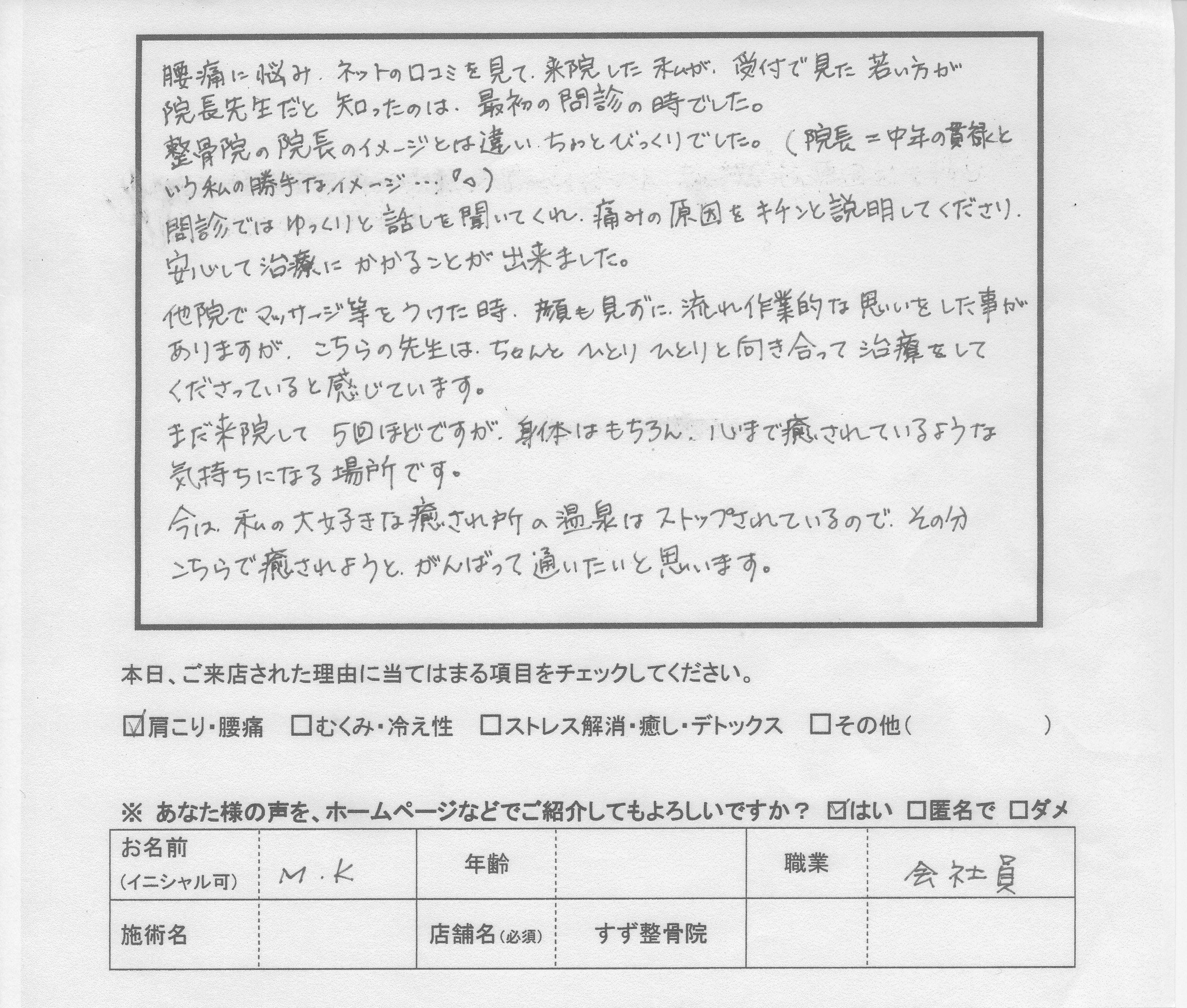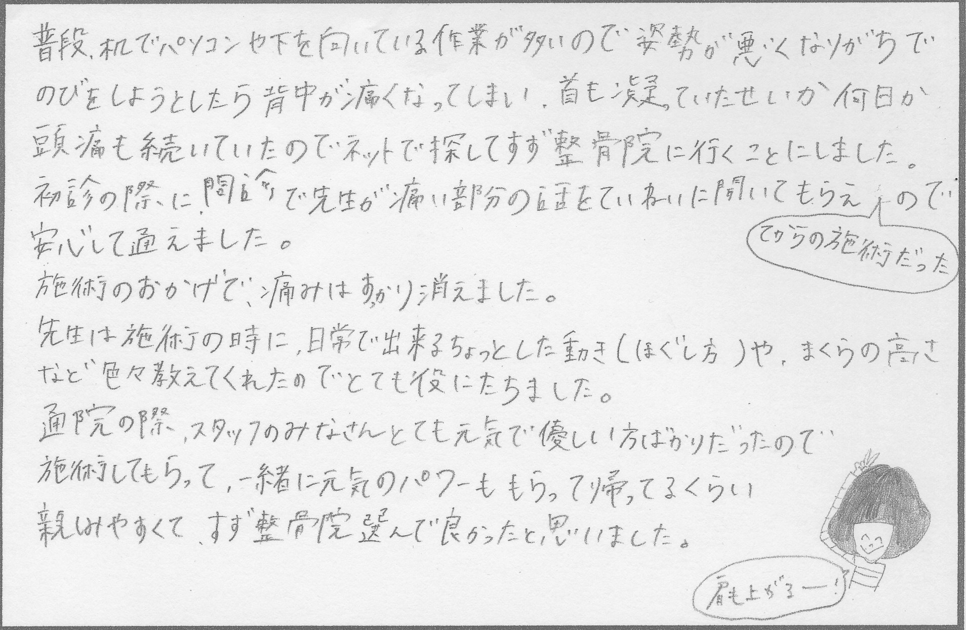 腰痛に悩み、ネットの口コミを見て来院した私ですが、受付で見た 女性会社員 普段、机でパソコンや下を向いている作業が多いので姿勢が 悪くなりがちで、のびをしようとしたら背中が痛くなってしまい、 首も凝っていたせいか何日か頭痛も続いていたのでネットで 探してすず整骨院に行くことにしました。 初診の際に問診で先生が痛い部分の話をていねいに 聞いてもらえてからの施術だったので安心して通えました。 施術のおかげで、痛みはすっかり消えました。 先生は施術の時に、日常で出来るちょっとした動き (ほぐし方)や、まくらの高さなど色々教えてくれたので とても役にたちました。 通院の際、スタッフのみなさんとても元気で 優しい方ばかりだったので、施術してもらって、 一緒に元気のパワーももらって帰ってるくらい親しみ やすくて、すず整骨院選んで良かったと思いました 25歳 学校職員 |